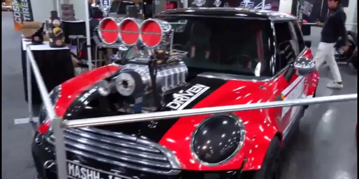 The show also highlighted advancements in vehicle aesthetics, particularly with paint jobs. Some newer vehicles demonstrated how far paint technology has come. Another attention-grabbing exhibit was a Mini Cooper from Burnout Nationals. This car is part of a display by Cosmo Tires, celebrating 31 years in the tire industry. The Mini Cooper showcased customized tires designed for high-performance drag racing.