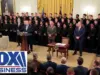 President Trump awarded the Commander in Chief's Trophy to the Navy Midshipmen football team, praising their historic season and the strength of the U.S. military. He also announced an executive order to preserve the Army-Navy game's exclusive time slot, calling it a vital national tradition.